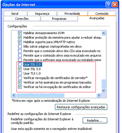 Vá em Ferramentas > Opções de Internet > Avançadas e deixa as opções selecionadas igual a área destacada na imagem abaixo: