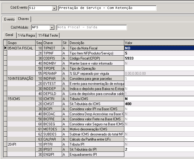 2. Verifique se existe o evento com código 512. Caso não exista, faça: