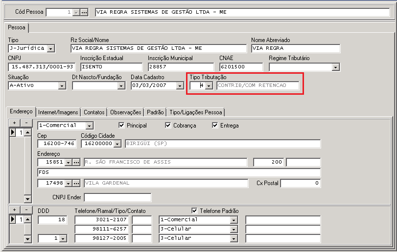 Alterar tipo de tributação nos Clientes