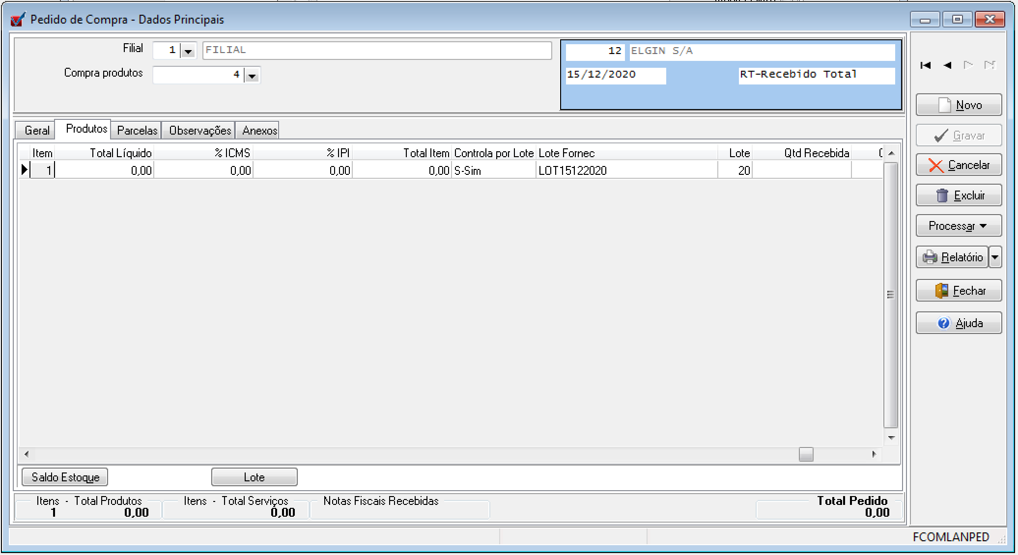 Após o processamento do pedido, o botão Lote poderá ser utilizado para da manutenção no lote gerado. (Ex: informar a validade do lote)
