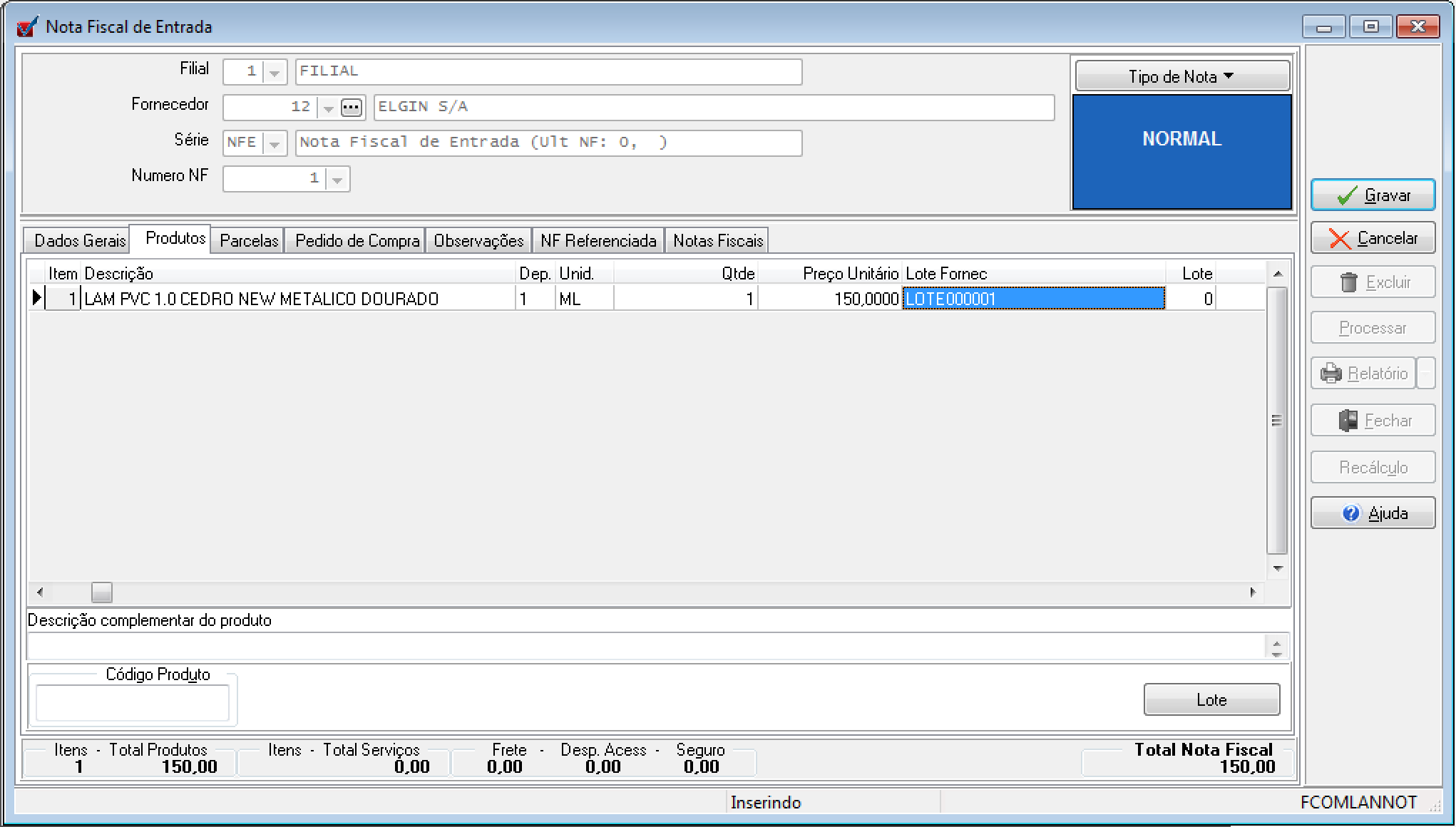 Produtos controlado por Lote exigirão o número do lote do fornecedor na lançamento.