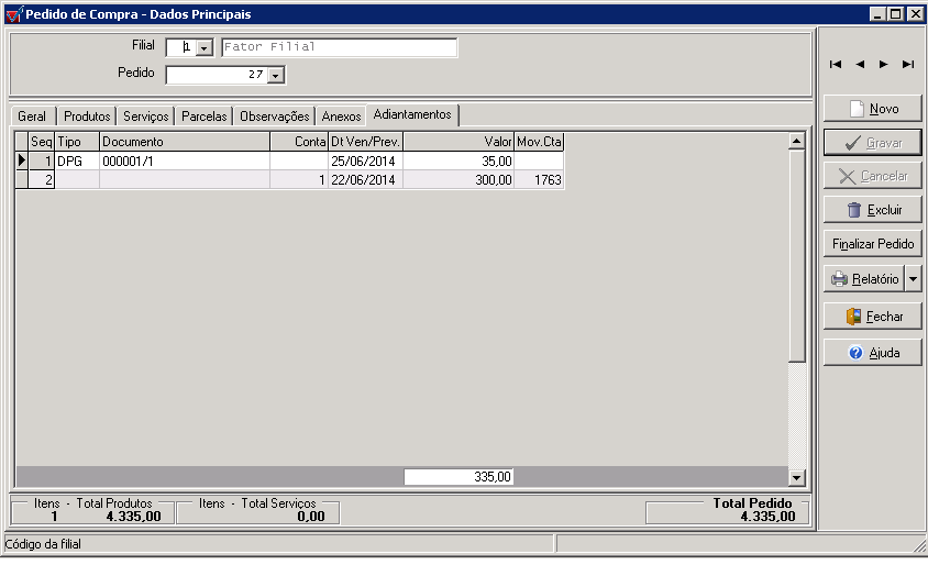 - No acerto financeiro, o valor do pedido de compra irá gerar parcelas no seu valor integral, e um título de crédito será gerado no financeiro com o valor adiantado. Esse valor poderá ser usado para debitar da(s) parcela(s) do pedido o valor anteriormente adiantado.
