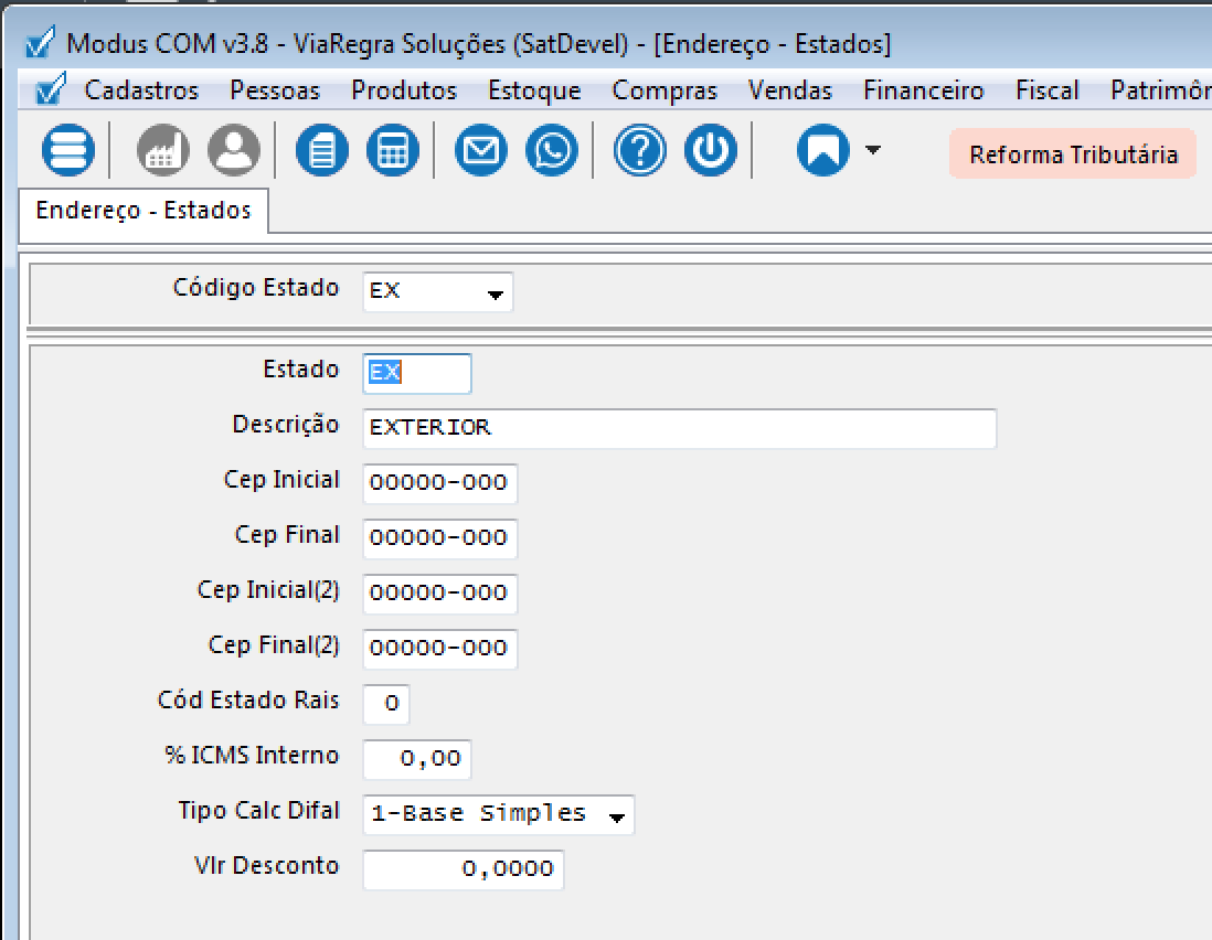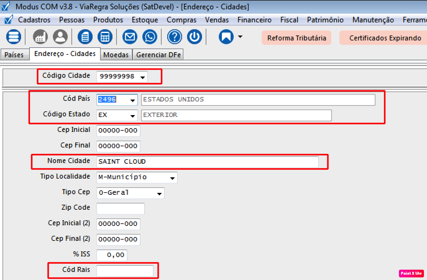 - Cadastrar a Cidade com o Codigo 99999999 ou o anterior mais proximo que esteja livre. Ex: 99999998, 99999997..