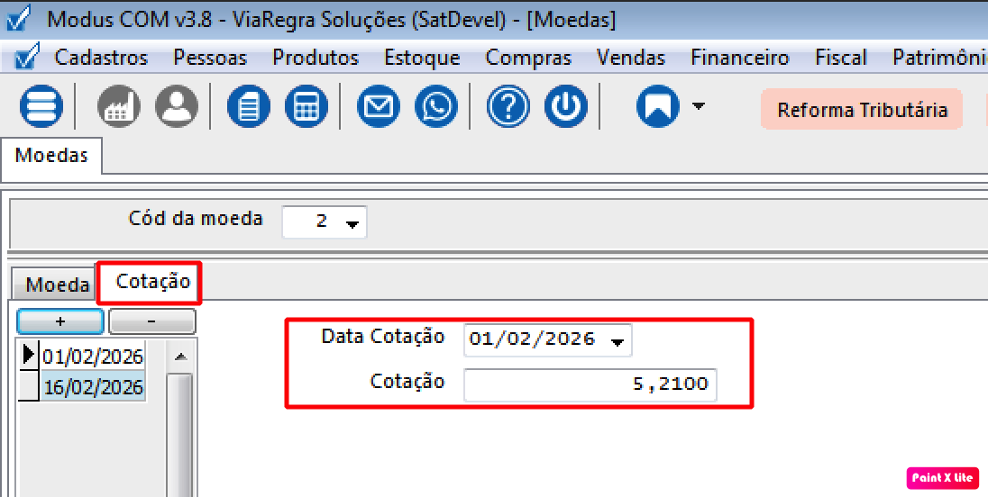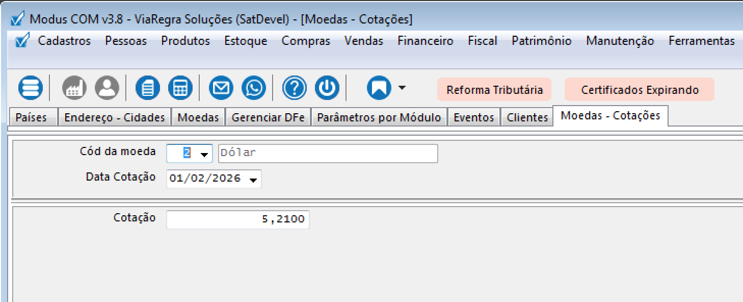 - Cadastre a cotação da moeda, o Sistema irá busca a partir da data de emissao da NF ou mais recente