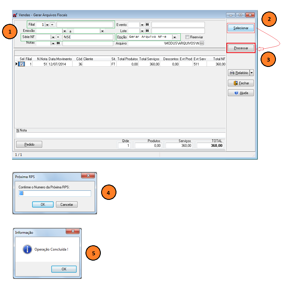 1. Informar Filial e Série da Nota Fiscal de Serviço, Opção Gerar Arquivo NF-e;