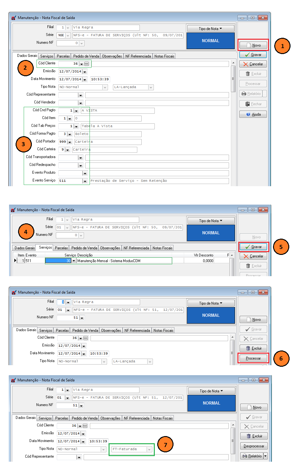 7. Confirme o processamento e aguarde. No final do processo observe que a nota fiscal deve ficar em situação FT-Faturada.