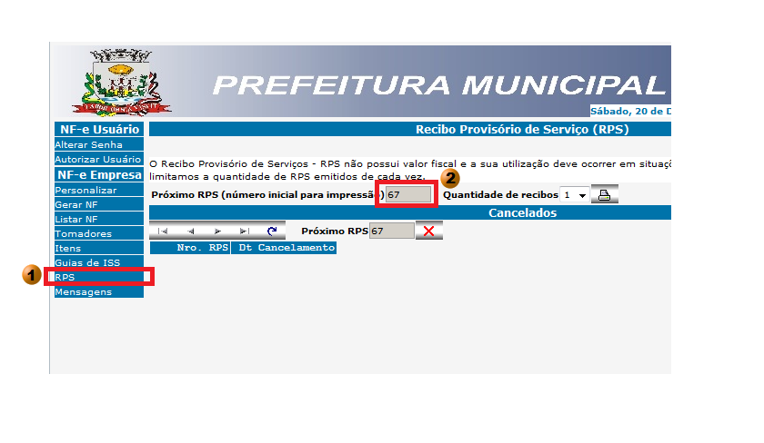 2. Anote o número da próxima RPS, à direita, em seguida informe-o no sistema quando solicitado