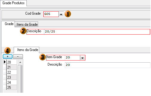 - 2: Descrição: A descrição da grade deve ser preenchida com o menor número e o maior número (ex: 20/25).