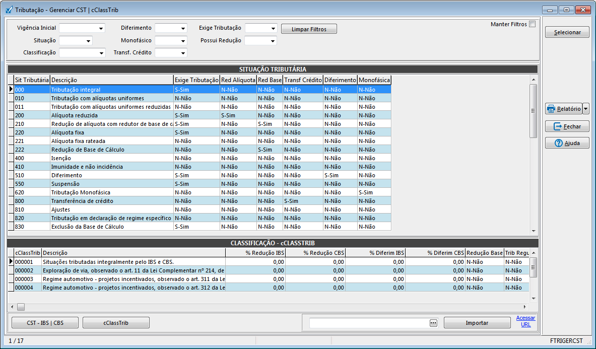 Permite o gerenciamento das Situações Tributárias(CST) e suas classificações (cClassTrib)