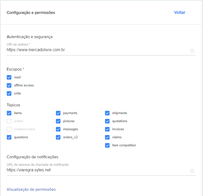 Para integração com Mercado Livre, é necessário cadastrar o aplicativo Modus na conta do vendedor e obter o ID do Aplicativo e a Secret Key. Com estas informações em mãos, cadastre os campos conforme abaixo: